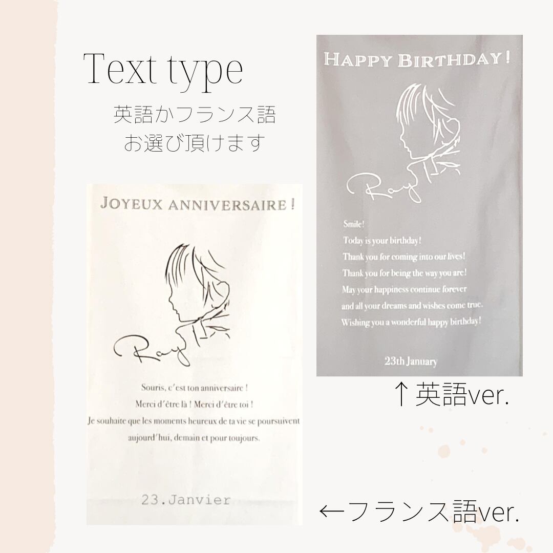 ご注文時、お名前(ローマ字表記)・お誕生日・タペストリーテキスト(英語orフランス語 )をオプションでご選択ください。またご注文後、お子様のお写真をメール([email protected])にお送りください。