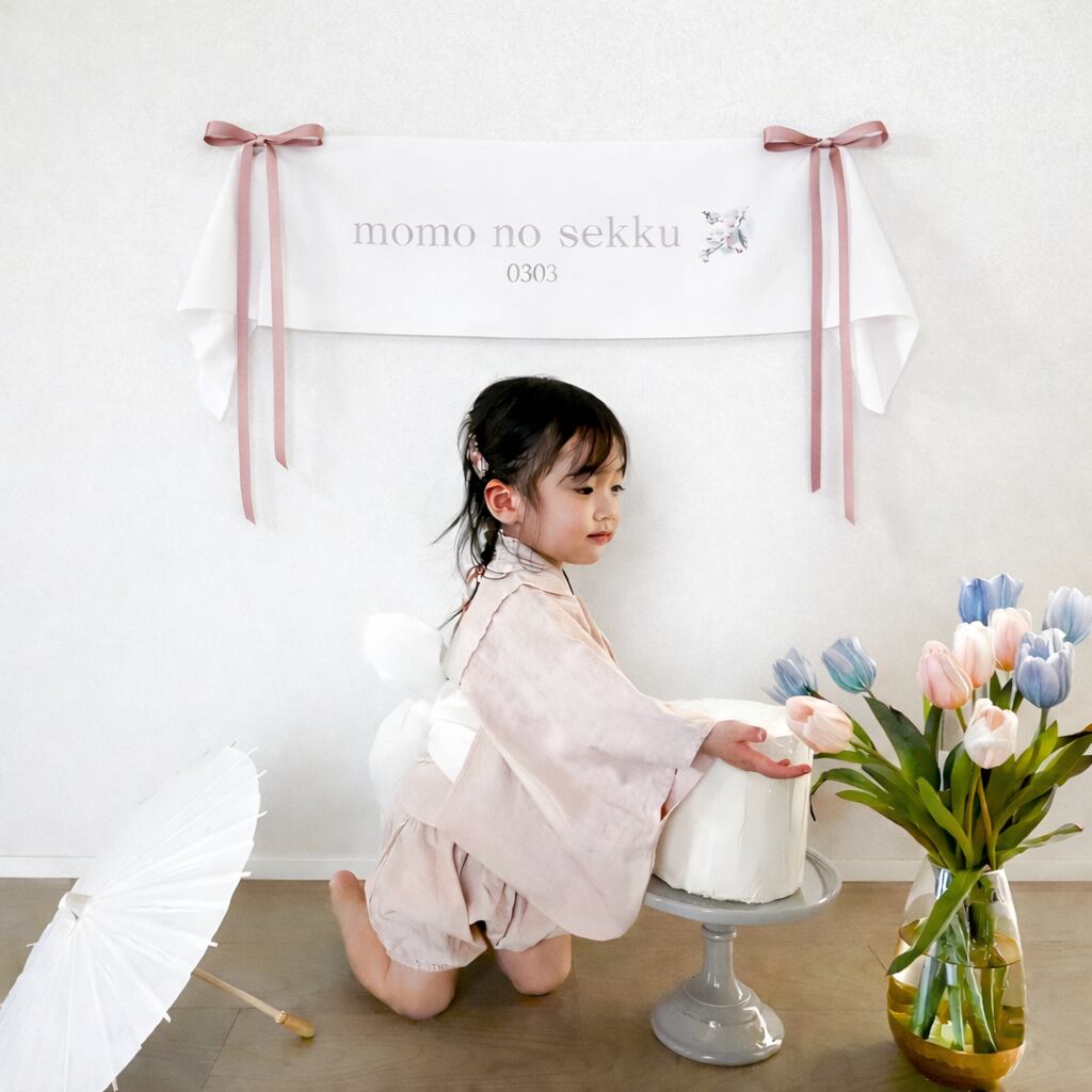 ひなまつり タペストリー 『 momo(もも)』 桃の節句 momo no sekku リボン くすみピンク 壁飾り 撮影布 コットンリネン 97×27cm 名入れなし